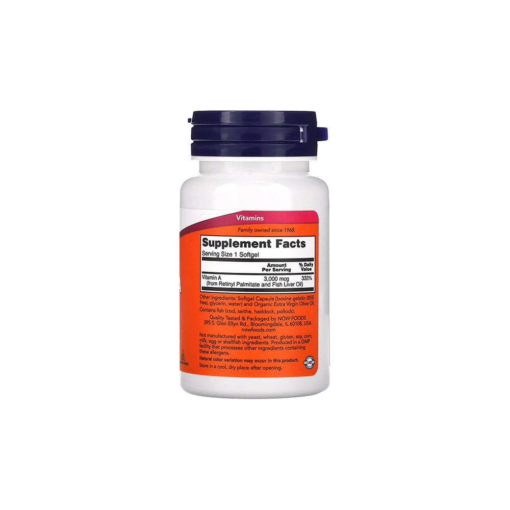 يحتوي هذا المكمل من ناو (NOW) على فيتامين أ النقي بتركيز 3,000 ميكروجرام (10,000 وحدة دولية)، وهو عنصر أساسي يدعم صحة الرؤية، ويعزز وظائف المناعة، ويساعد في الحفاظ على صحة البشرة والأغشية المخاطية.
